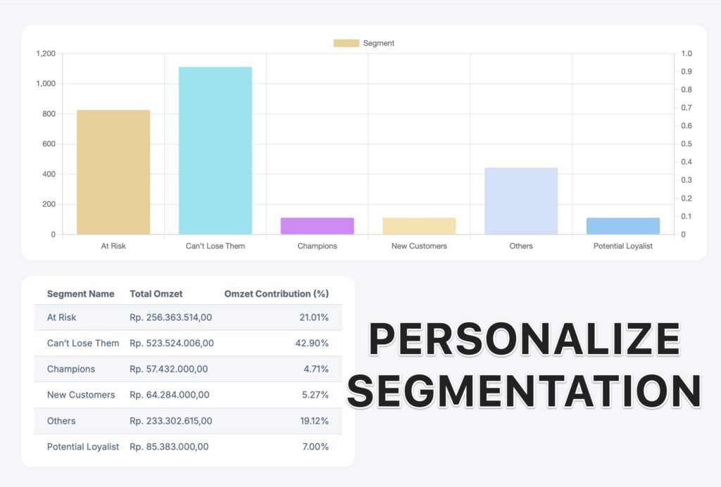 Model RFM otomatis mengidentifikasi pelanggan high-value dan yang rawan churned, sehingga tim Anda bisa prioritaskan effort dengan tepat.